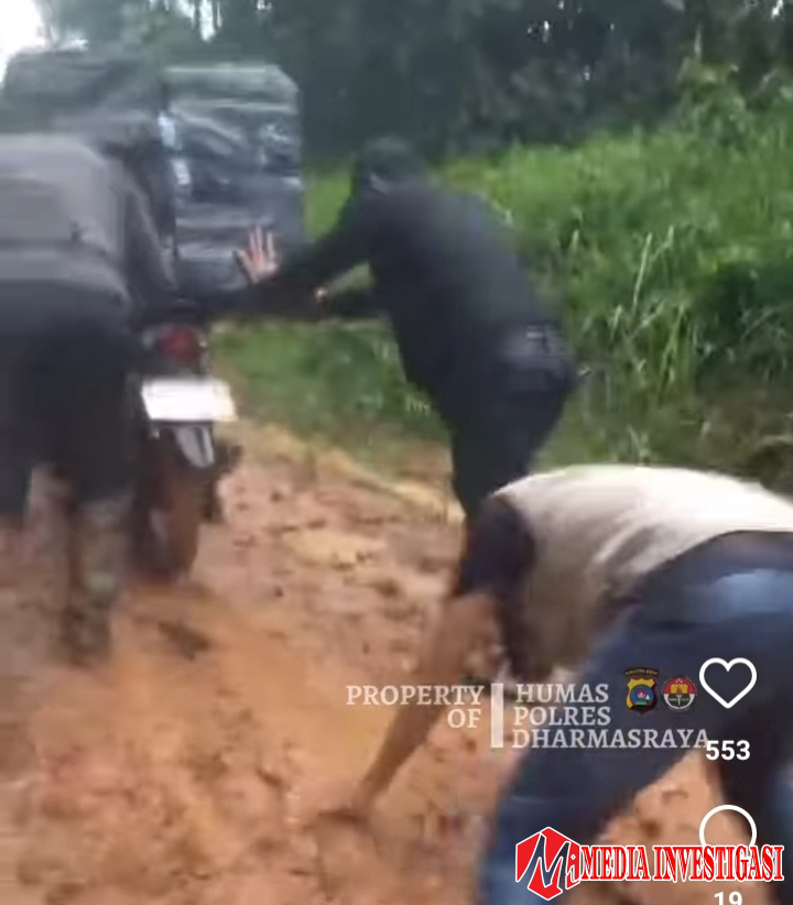 Viral di IG Polres Dharmasraya, Salah satu petugas tengah berupa mendorong kendaraan di tengah hujan kondisi jalan licin dan berlumpur di Lubuk Labu (Dok, Istimewa)