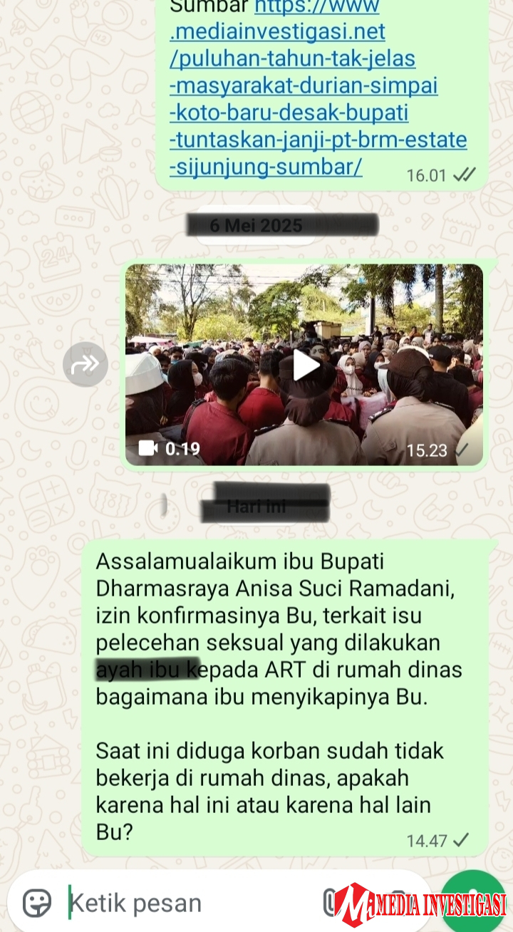 “Assalamualaikum Ibu Bupati Dharmasraya Anisa Suci Ramadani, izin konfirmasinya Bu, terkait isu pelecehan seksual yang dilakukan M kepada ART di rumah dinas bagaimana ibu menyikapinya Bu? Saat ini diduga korban sudah tidak bekerja di rumah dinas, apakah karena hal ini atau karena hal lain Bu?”