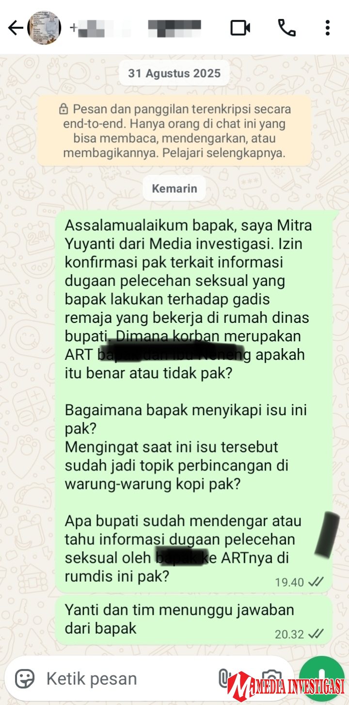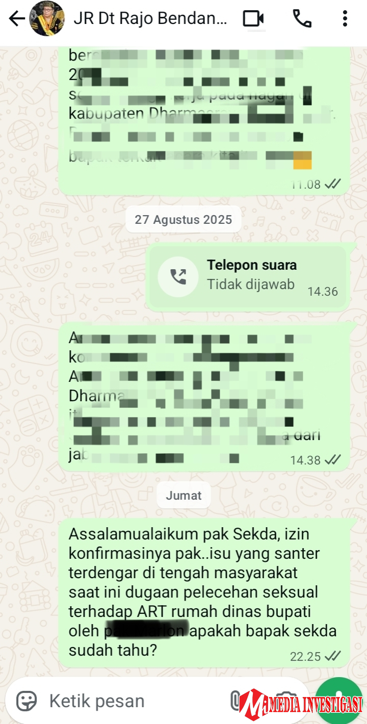 Media ini telah berupaya mengonfirmasi pihak yang diduga melakukan pelecehan melalui pesan WhatsApp pada Kamis (2/10) sekitar pukul 19.40 WIB. Beberapa pertanyaan tegas disampaikan, mulai dari kebenaran tuduhan hingga bagaimana yang bersangkutan menyikapi isu yang kini ramai dibicarakan di warung-warung kopi Dharmasraya.