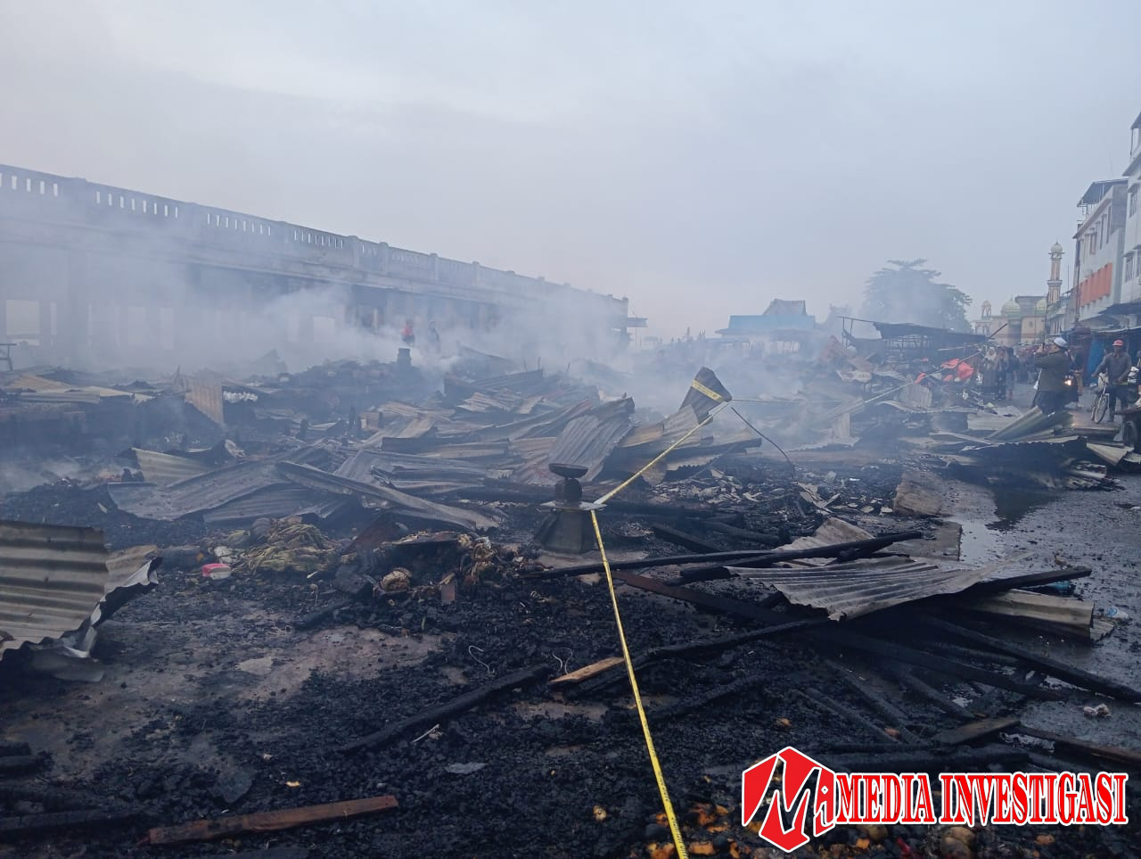 Asap hitam tebal membumbung tinggi ke langit, sementara nyala api tampak jelas dari berbagai sudut kota. Tampak beberapa pedagang menyelamatkan cabai merah dalam gerobak/angkong untuk dievakuasi ke tempat aman.
