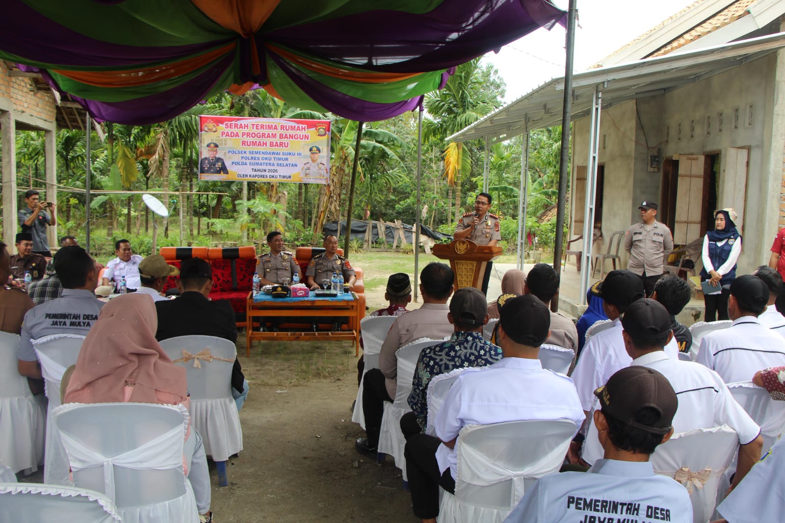 saya ucapkan terimakasih atas kehadiran Bapak Kapolres OKU Timur serta dukungan para Kades dan masyarakat dalam program ini. semoga rumah baru ini dapat bermanfaat bagi masyarakat khususnya penerima manfaat di Ds. Mujorahayu dan Ds. Jaya Mulya, “jelasnya,