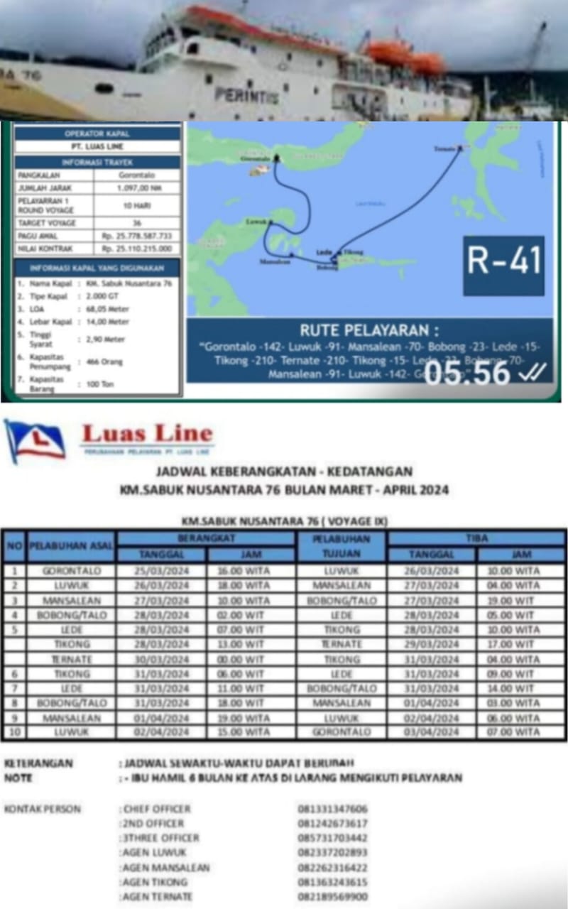 Kepada mediainvestigasi,net, Kepala Dinas Perhubungan Kabupaten Pulau Taliabu, H. Irwan Mansur melalui via Whatssap mengatakan bahwa saat ini rute Sabuk Nusantara 76 bertambah. Gorontalo, Luwuk, mansalen, bobong, Tikong Ternate PP kini bertambah dengan dermaga lede. ungkap Irwan Mansur Kepala Dinas Perhubungan Kabupaten Pulau Taliabu, “tuturnya.