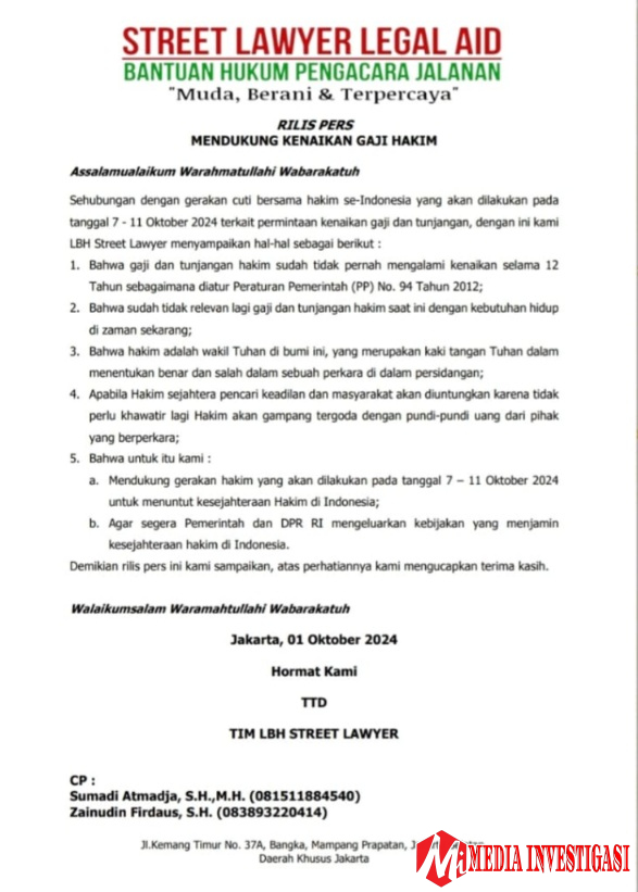 MEDIAINVESTIGASI.NET – Sehubungan dengan gerakan cuti bersama hakim se-Indonesia yang akan dilakukan pada tanggal 7 – 11 Oktober 2024 mendatang, terkait permintaan kenaikan gaji dan tunjangan untuk para hakim se-Indonesia, LBH Street Lawyer menyampaikan dalam keterangan pers tertulis nya dengan hal-hal sebagai berikut.