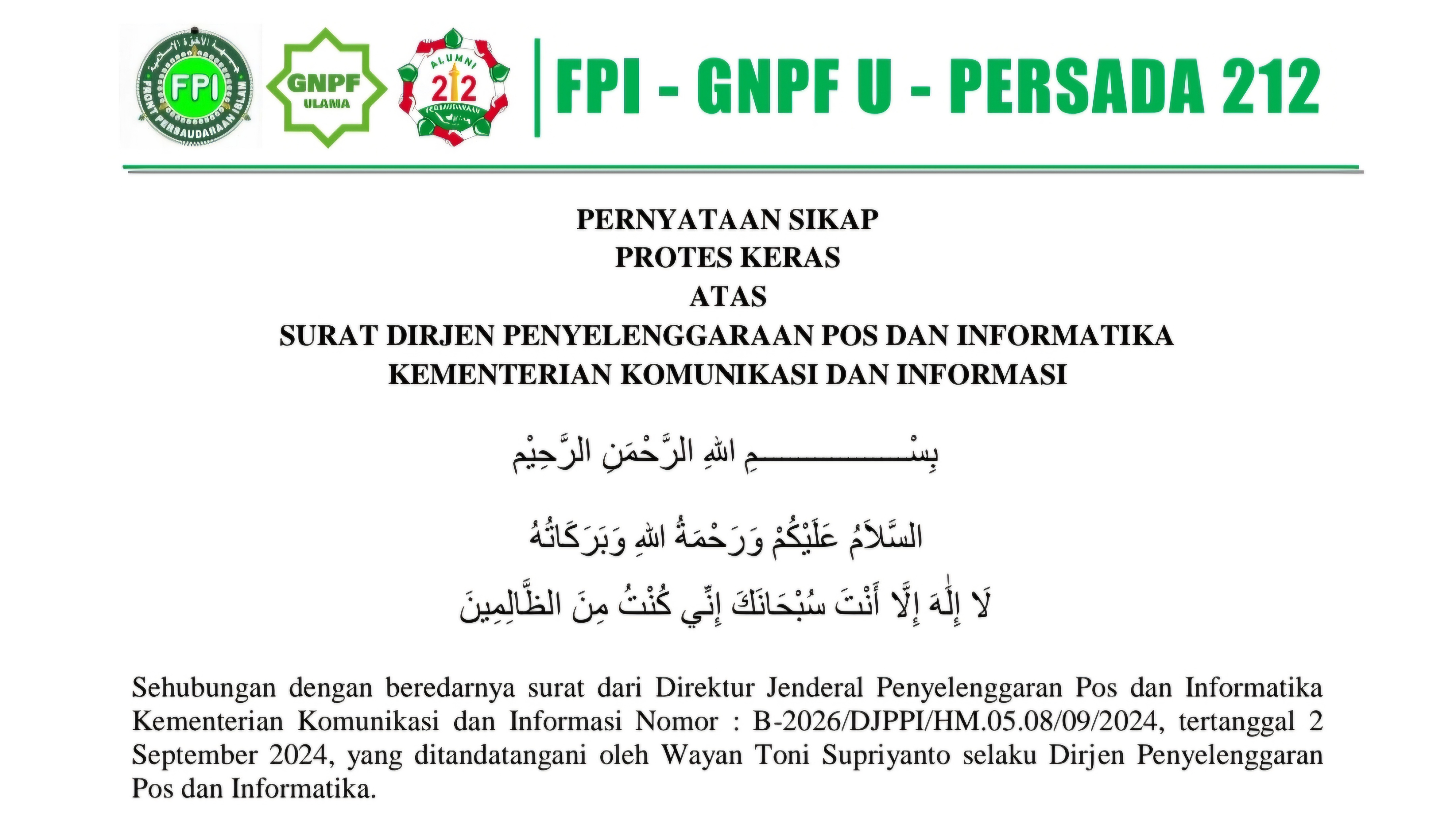 MEDIAINVESTIGASI.NET – Front Persaudaraan Islam (FPI), GNPF Ulama, dan Persaudaraan Alumni 212, menunjukkan pernyataan sikap protes keras atas surat Dirjen Penyelenggaraan Pos dan informatika, Kementerian Komunikasi dan Informatika.