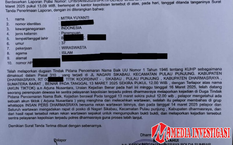 Dharmasraya, Mediainvestigasi.net– Dunia jurnalistik di Dharmasraya tengah bergejolak. Seluruh wartawan yang tergabung dalam Aliansi Insan Pers Dharmasraya dengan tegas melaporkan pemilik akun TikTok @Arjuna Nusantara ke pihak kepolisian atas dugaan pencemaran nama baik.