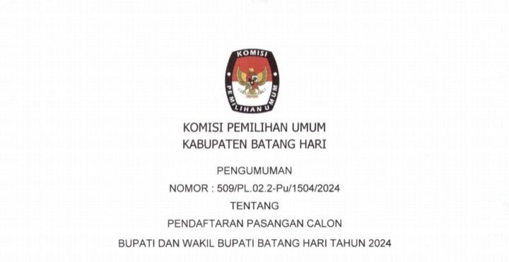 Merujuk pada ketentuan diatas, ketua Komisi Pemilihan Umum (KPU) Kabupaten Batang Hari, Ahmad Halim, S.Pd.I. Telah mengeluarkan surat keputusan pengumuman Nomor : 509/PL.02.2-Pu/1504/2024 Tentang Pendaftaran Pasangan Calon Bupati dan Wakil Bupati Batang Hari Tahun 2024, Sabtu (24/08/2024).