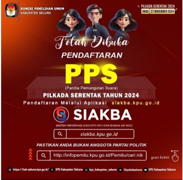 Diketahui, sebanyak 606 orang anggota Panitia Pemungutan Suara (PPS) yang akan di lakukan perekrutan atau seleksi oleh KPU Seluma, pembukaan perekrutan tersebut DI MULAI PADA “2 mei sampai dengan 8 mei 2024” segera daftarkan diri anda.