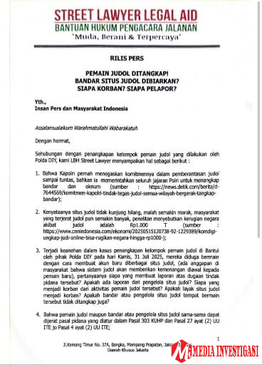 “Pertanyaannya, siapa pelapor dalam kasus ini? Apakah pengelola situs judol? Apakah layak situs ilegal semacam itu dianggap sebagai korban?” tegas Sumadi Atmadja, S.H., M.H., salah satu pengacara dari LBH Street Lawyer dalam rilisnya, Minggu (4/8/2025).