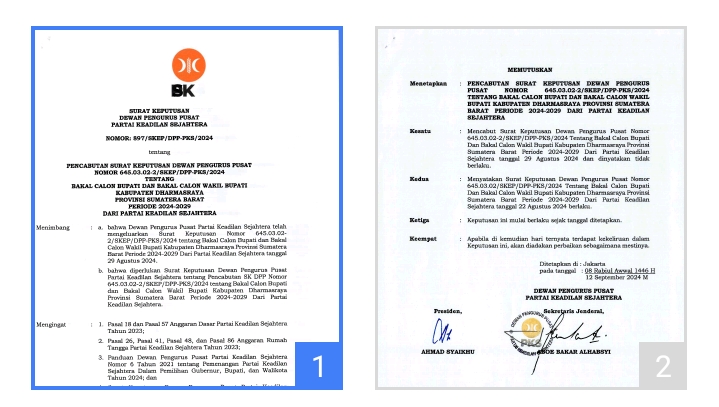 PKS mencabut SK Nomor 645.03.02-2/SKEP/DPP-PKS/2024, yang sebelumnya menetapkan pasangan calon Bupati dan Wakil Bupati Dharmasraya periode 2024-2029. Dengan pencabutan tersebut, keputusan tanggal 22 Agustus 2024 kembali diakui, menunjukkan adanya dinamika internal partai yang signifikan.