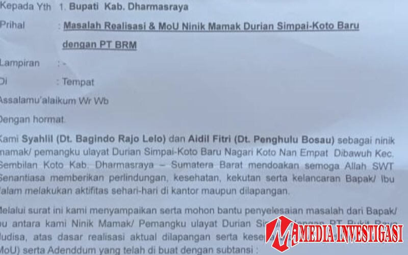 Terpisah, Rosmanita (56), warga Durian Simpai, mengaku pihak Niniek Mamak kami telah mengirim surat resmi kepada Bupati Dharmasraya pada 24 Maret 2025 lalu. Namun hingga kini belum ada tindakan konkret dari pemimpin daerah.