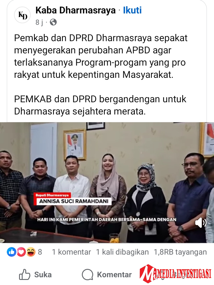 Dharmasraya, Mediainvestigasi.net – Panggung politik Dharmasraya kembali menampakkan wajah ironis. Setelah berhari-hari DPRD digempur buzzer, influencer, hingga media online di bawah intervensi Kominfo Dharmasraya, tiba-tiba pada Minggu (31/08/2025), Bupati Anisa Suci Ramadani bersama Wakil Bupati Leli Arni justru mengundang pimpinan DPRD ke rumah dinasnya.