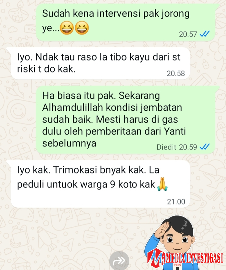 Tudingan itu dilayangkan terhadap wartawan mediainvestigasi.net yang memberitakan kondisi lapuknya lantai jembatan di Jorong Pulau Anjolai, Nagari Koto Nan Ampek Dibawuah, Kecamatan Sembilan Koto. Berita berjudul “Warga Pulau Anjolai Swadaya Perbaiki Jembatan Lapuk, Bupati Anisa Pilih Tutup Mata” itu justru berangkat dari fakta di lapangan hasil wawancara dengan Kepala Jorong Pulau Anjolai, Bobi, dan sejumlah warga setempat pada Sabtu (06/09/2025).