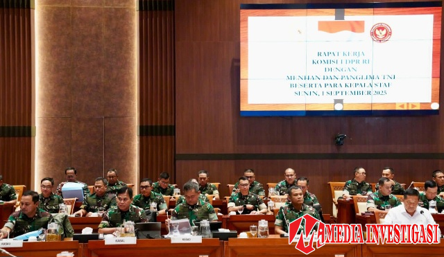 MEDIAINVESTIGASI.NET – Wakil Panglima TNI Jenderal TNI Tandyo Budi R bersama Wakil Menteri Pertahanan Republik Indonesia (Wamenhan RI) Donny Ermawan Taufanto, didampingi para Kepala Staf Angkatan menghadiri Rapat Kerja bersama Komisi I Dewan Perwakilan Rakyat (DPR RI), bertempat di Ruang Rapat Komisi I DPR RI, Kompleks Gedung MPR/DPR, Senayan, Jakarta Pusat, Senin (01/09/2025).